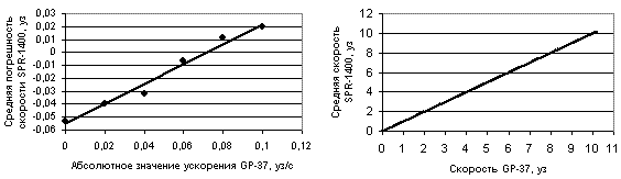 Рис. 3. Зависимости средней скорости от ускорения (слева) и средней скорости SPR-1400 от скорости приёмника GP-37