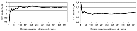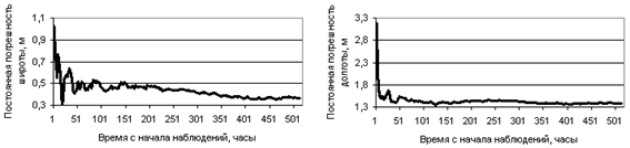Вычисление постоянных погрешностей не было единственной целью обработки сформированного массива. Важно также было получить характеристики сходимости. Поэтому расчёты постоянных погрешностей и СКП (σ) в метрах широты и долготы выполнялись по мере увеличения времени с начала наблюдений на каждый целый час. Расчёты на примере широты проводились по следующим формулам: