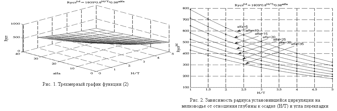 В таблице 2 сведены результаты статистического регрессионного анализа зависимости радиуса установившейся циркуляции на мелководье RMуст от отношения глубины к осадке Н/Т. Во всех случаях коэффициент парной корреляции превышает 0,94. Такие же результаты получены для выдвига и тактического диаметра циркуляции.