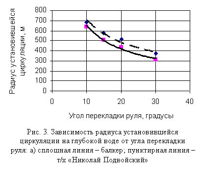 – в дальнейшем модели судна останавливались через каждые 10о изменения курса. Снимались те же данные, которые указаны выше, за исключением перекладки руля.