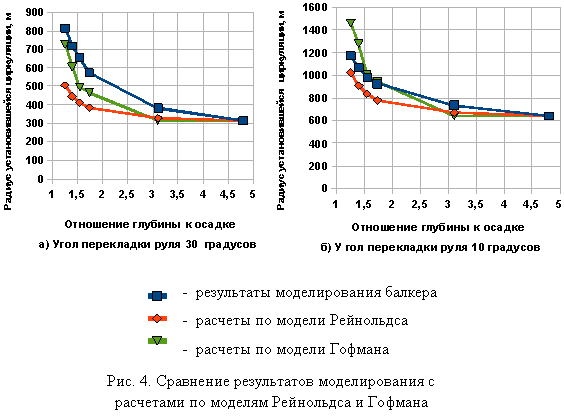 В связи с этим представляется целесообразным наличие на борту каждого крупного судна дополнительных кривых циркуляции для промежуточных углов перекладки руля и, что особенно важно, для различных отношений глубины к осадке судна. В настоящее время получение такой информации возможно лишь с помощью моделирования. В настоящей статье представлены результаты моделирования движения судов на циркуляции в условиях мелководья, которые сравниваются с данными натурных испытаний и расчетами, выполненными с применением имеющихся математических моделей.