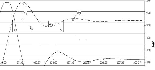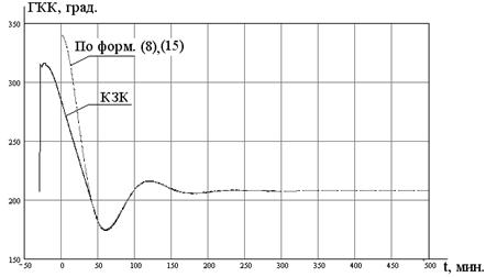 Вид экспериментальной кривой затухающих колебаний за 10.03.09 г. и рассчитанных по формулам (8) и (15) переходных процессов показан на рис. 2. Несовпадение кривых на начальном участке объясняется следствием того, что после режима «Горизонтирования» ГАК был выведен ускоренно из меридиана, а затем переведен в режим «Работа». Индикатор горизонта длительное время находился на упоре (t =25¸75 мин.), что исказило переходной процесс в начальный период.
