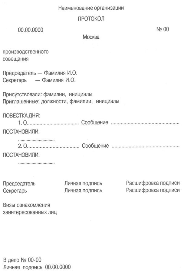 2. Сокращённая, в тексте которых печатают фамилии выступающих в порядке их выступления. Название каждого доклада заканчивается решением или постановлением. Пример сокращённого протокола дан на стр.