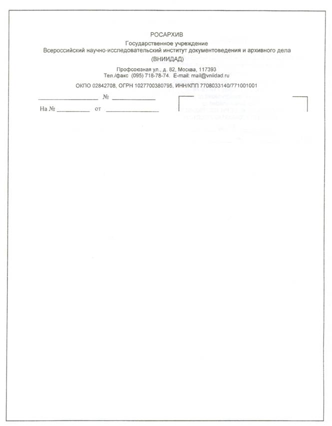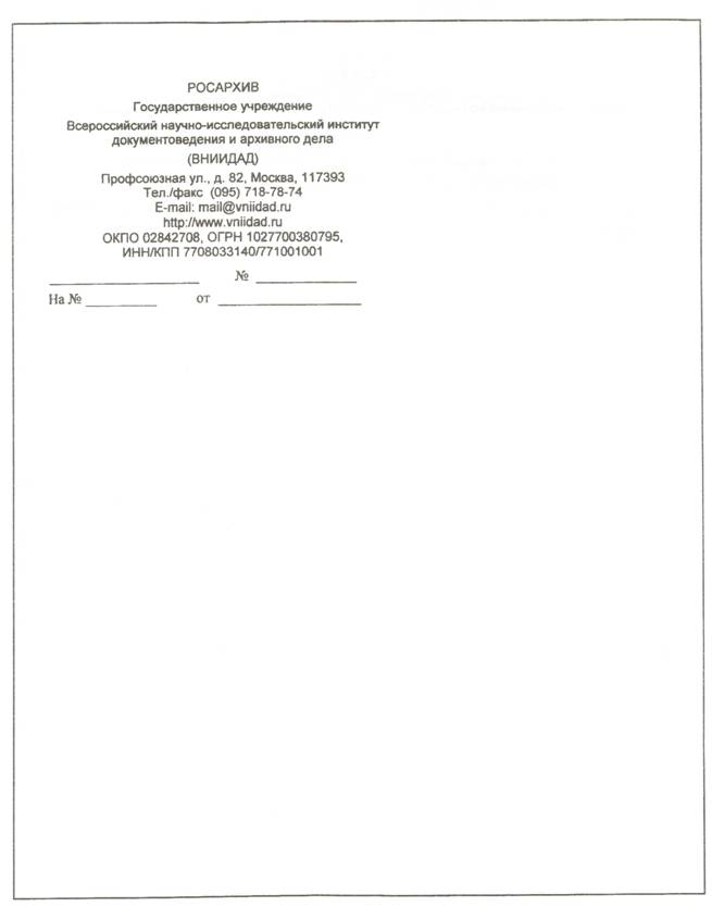 Государственное учреждение Всероссийский научно-исследовательский институт документоведения и архивного дела Профсоюзная ул., д. 82, Москва, 117393