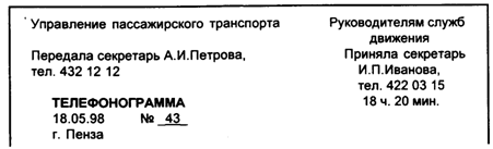 После передачи телефонограммы попросите записавшего повторно прочитать текст, чтобы убедиться в правильности записи. Фамилии и трудновоспринимаемые на слух слова передаются с разбивкой по буквам, допущенные ошибки исправляются. В организации может быть специальный бланк для телефонограмм, если они составляются часто. Но обычно они оформляются на чистом листе бумаги. Юридическая сила поступившей телефонограммы гарантируется реквизитами: исходящий регистрационный номер отправляемой телефонограммы, должность, фамилия, имя, отчество лица, отправившего телефонограмму, подпись лица, принявшего телефонограмму и входящим регистрационным номером полученной телефонограммы.
