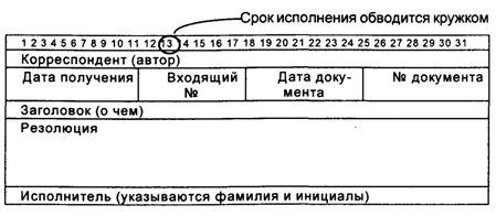 Заполнив карточку, одну из них помещают в сроковую картотеку, другую в информационно-справочную, а документ передают исполнителю для работы с ним.