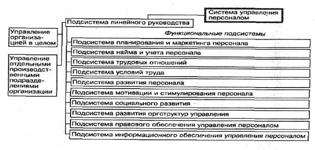 В ряде организаций создаются системы управления персоналом, объединяющие под единым руководством заместителя директора по управлению персоналом все подразделения, имеющие отношение к работе с кадрами. Система управления персоналом организации - система, в которой реализуются функции управления персоналом. Она включает подсистему линейного руководства, а также ряд функциональных подсистем, специализирующихся на выполнении однородных функций (рис. 1.2).