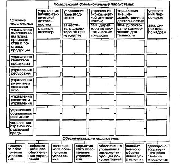 продукции (оказания услуг); управления качеством продукции; управления трудовыми, финансовыми, материальными ресурсами; управления развитием производства; управления развитием системы управления; управления социальным развитием организации; управления охраной окружающей среды. Состав целевых подсистем может меняться в зависимости от требований производства и внешней среды организации. Так, в период реконструкции может быть создана целевая подсистема управления реконструкцией организации и соответствующее подразделение (отдел реконструкции). По окончании реконструкции такая подсистема прекращает свое существование и т. п.