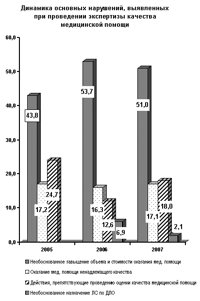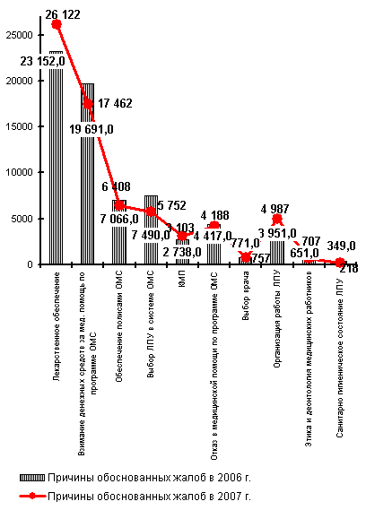 В общем количестве причин обоснованных жалоб граждан (71 180) основное место занимают жалобы по вопросам: лекарственного обеспечения — 36,7% (2006 г. — 32,5%); взимания денежных средств за медицинскую помощь по программе ОМС — 24,5% (2006 г. — 27,7%); обеспечения полисами ОМС — 9% (2006 г. — 9,9%); выбора ЛПУ в системе ОМС — 8,1% (2006 г. — 10,5%) (приложение 3).