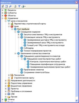 - стратегические цели, являющиеся декомпозицией наивысшей цели организации (количество уровней зависит от детальности проработки стратегии), целевые значения показателей для определения верхнего уровня системы целей организации.