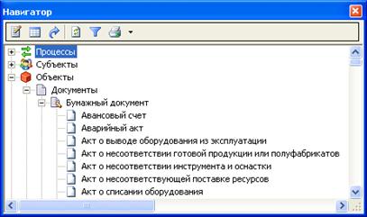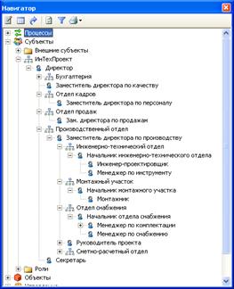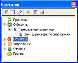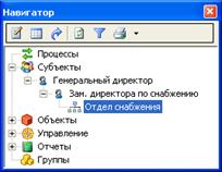 Организационная структура в Business Studio содержит иерархический перечень должностей и подразделений компании. Данный перечень необходим для назначения Владельцев и Исполнителей процессов. Организационная структура вводится в специальном справочнике Субъекты, доступ к которому находится в разделе «Субъекты» Навигатора (Рис.26):