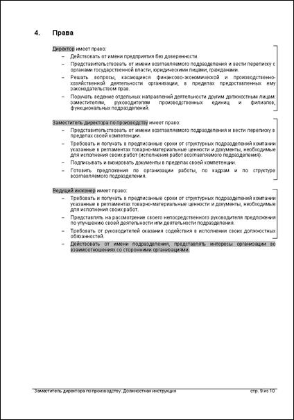 Права – дополнительные к тем правам, которые указаны в шаблоне регламента «Должностная инструкция». |