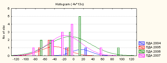 Кривые, соответствующие 2004, 2005, 2006, 2007 г., характеризуются данными, представленными в таблице ниже.
