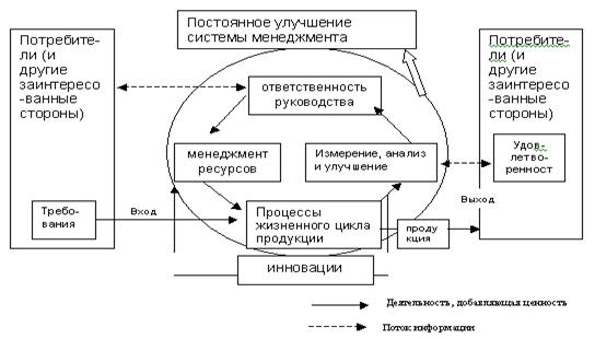 «Международные стандарты семейства ISO 9000 основываются на понимании того, что всякая работа выполняется с помощью процессов. Каждый процесс имеет вход. Выход – продукция материальная или нематериальная. Процесс сам по себе является (или должен быть) преобразованием, которое добавляет ценность. Каждые процессы включают определенным образом трудовые и/или другие ресурсы. Выходом может быть, например, фактура, программный продукт и т. д.