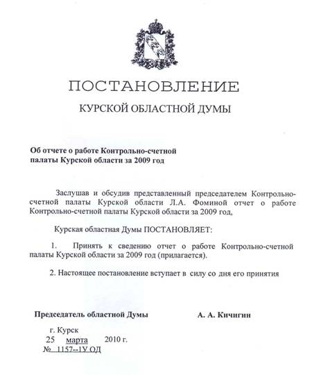 Отчет о работе Контрольно-счетной палаты Курской области за 2009 год депутаты Курской областной Думы рассмотрели и приняли к сведению на состоявшемся 25 марта 2010 года заседании областной Думы.