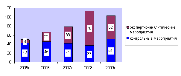 За 2009 год Контрольно-счетной палатой проведено 103 контрольно-ревизионных и экспертно-аналитических мероприятий, из них 11 с использованием принципов аудита эффективности.