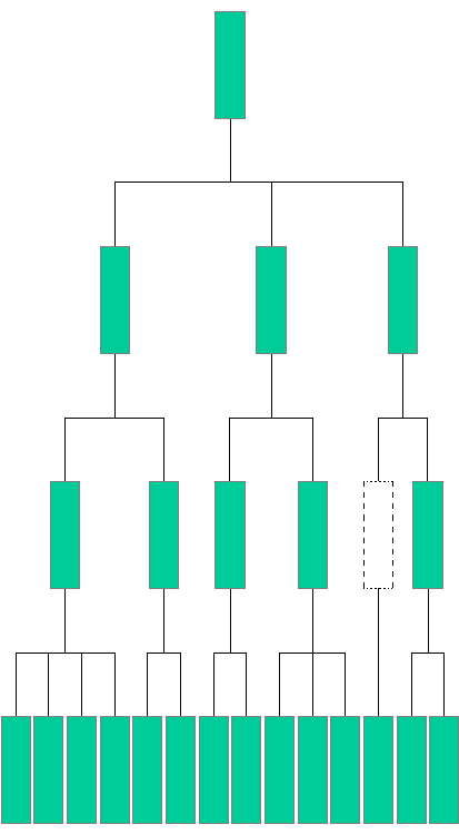 В качестве иллюстрации на следующем рисунке приведен пример иерархической организации системы критериев оценки заявок и соответствующей системы оценок. Для случаев, когда по разным направлениям декомпозиция завершается на разных уровнях иерархии, в качестве примера введен фиктивный обобщенный критерий (на рисунке – второй справа на втором уровне иерархии изображен пунктиром), который не обобщает несколько критериев с нижнего уровня, а вводится для того, чтобы все частные критерии/ оценки оказались на нижнем уровне иерархии.