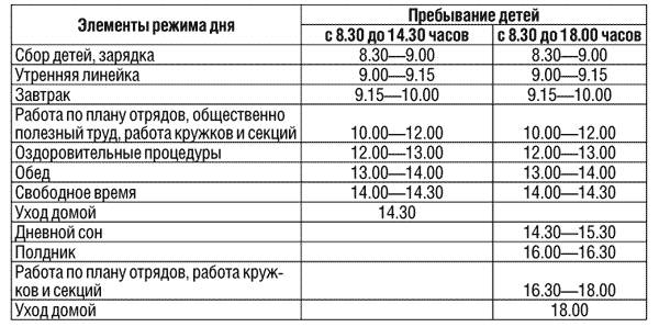 - с 8.30 до 18.00 часов, с обязательной организацией дневного сна для детей в возрасте до 10 лет и 3-разового питания (завтрак, обед, полдник). Рекомендуется организация дневного сна и для других возрастных групп детей и подростков.