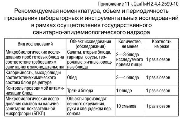 Порядок и объем проводимых лабораторных и инструментальных исследований устанавливается юридическим лицом или индивидуальным предпринимателем, обеспечивающим и (или) организующим питание, независимо от форм собственности, профиля производства в соответствии с рекомендуемой номенклатурой, объемом и периодичностью проведения лабораторных и инструментальных исследований (приложение 11 настоящих санитарных правил).