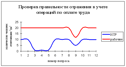 В диссертационной работе было проведено анкетирование для оценки состояния системы бухгалтерского учета материальных расходов на осуществление капитального строительства и учета операций по оплате труда в ООО «СК "ЭлитЖилСтрой"», где списочный состав 50 человек, из них 30 протестировано (10 ИТР и 20 рабочих различных строительных профессий). При исследовании учета операций по оплате труда статистический анализ позволяет выявить «контрольные точки» для аудита (график 1).
