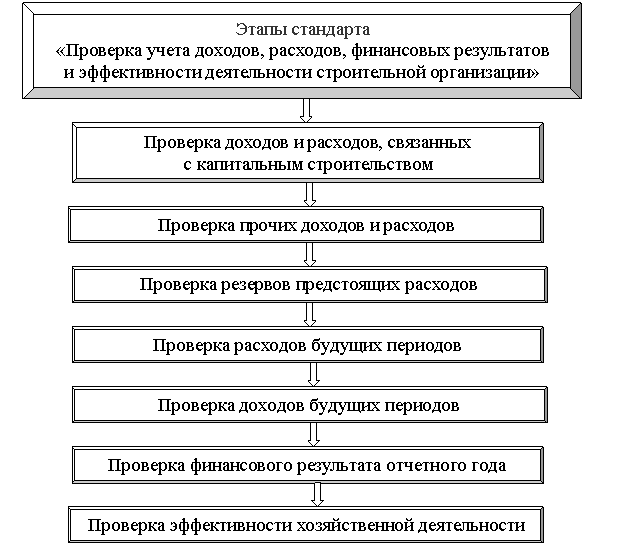 Решение вышеуказанных задач необходимо для оценки целесообразности и правильности осуществления затрат на производство строительно-монтажных работ и предусматривает обследование, наблюдение и контрольные обмеры выполненных работ. Для детальной проверки доходов, расходов и финансовых результатов выполняется ряд последовательных этапов, представленных на рисунке 5.