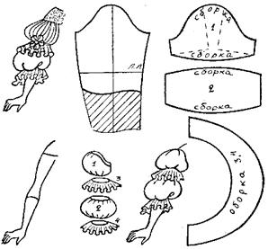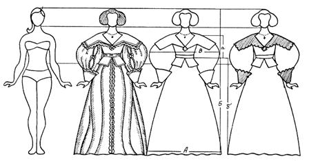 Рукава к лифам второй половины века (рис. 5) лучше делать из легкой ткани с перехватами из лент. Моделируют его также на одношовной основе. Низ рукава заканчивается раструбом из основной ткани или кружева, а иногда двумя – тремя небольшими отделочными буфами или сборками. Кроить рукав следует из одного куска, увеличив его в длину и ширину, в зависимости от количества и величины буфов, которые закрепляют на узкий нижний рукав-подкладку. Между подкладкой и буфами прокладывают слабо накрахмаленную марлю.