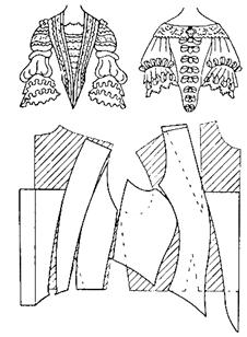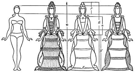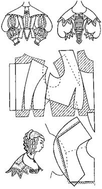 В лифах второй половины XVII века изменяются пропорции (рис. 4). Лиф становится жестче и длиннее. Грудь приподнимается, талия подчеркнута. Под лиф надевается корсет, благодаря чему торс кажется удлиненным и легким. Шнип узкий и заостренный. Линии деталей лифа несколько вогнуты. Линию плеча переносят к спине, на которую наносят две фасонные линии. Декольте круглое или глубокое каре, иногда открывают плечи. Шнип завершается бантом. На перед лифа нашиваются банты, розетки, ленты, кружева или вышивка.