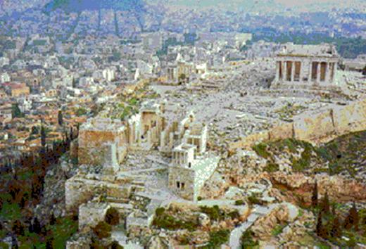 Афинский Акрополь, представляющий собой 156-метровый скалистый холм с пологой вершиной (ок. 300 м в длину и 170 м в ширину), место древнейшего поселения в Аттике. В микенский период (15-13 вв. до н. э.) являлся укрепленной царской резиденцией. В 7-6 вв. до н. э. на Акрополе велось большое строительство. При тиране Писистрате (560-527) на месте царского дворца был построен храм богини Афины Гекатомпедон (т. е. храм длиною в сто шагов; сохранились фрагменты скульптур фронтонов, выявлен фундамент). В 480 во время греко-персидских войн храмы Акрополя были разрушены персами. Жители Афин дали клятву восстановить святыни только после изгнания врагов из Эллады.