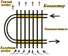 Конвекторы - отдают тепло в основном за счет циркуляции воздуха через них. По трубе конвектора движется теплоноситель, нагревая поверхности "надетой" на него "гармошки". Воздух проходит сквозь конвектор снизу вверх, нагреваясь от многочисленных теплых поверхностей.