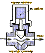 В регулирующем кране есть клапан, который перекрывает доступ горячей воды (теплоносителя) в радиатор, если температура воздуха уже достигла установленной Вами величины, и открывает доступ, если температура упала. Внутри термоголовки, навинчивающейся на кран, есть емкость, заполненная парафином. При нагревании парафин расширяется и давит на закрывающий клапан. По мере остывания объем парафина уменьшается, и клапан начинает открываться. Вращая термоголовку, можно задать температуру воздуха в комнате, при достижении которой клапан будет закрываться. Термоголовка устанавливается обязательно горизонтально и ее нельзя изолировать от воздуха в комнате.