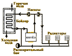 При монтаже бойлера в системе предусматривается отдельный насос, подающий теплоноситель в бойлер, независимо от отопительной системы. Летом насос отопительной системы отключается, и котел работает только на подогрев бытовой воды.