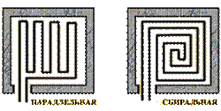 При устройстве напольного отопления трубы укладываются по всей поверхности пола параллельно (зигзагом) или спиралью. Используются гибкие металлополимерные трубы, которые укладываются из одного целого куска трубы, без соединительных деталей.