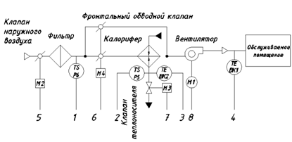 Изменение соотношений расходов воздуха через калориферы и обводной канал производится по сигналам регулятора температуры Р4 с датчиком ВК2, установленным в трубопроводе теплоносителя. Управляющие сигналы через релейно-импульсный прерыватель РЗ подаются на исполнительный механизм М4 фронтально-обводного клапана.