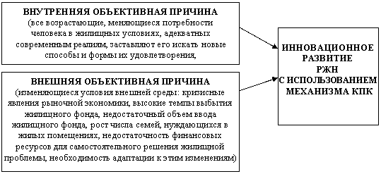 Предпосылками формирования инновационного развития РЖН с использованием механизма КПК являются изменения внешней среды и потребностей человека (рис. 1). Применение инновационного подхода в решении жилищной проблемы через механизм КПК реализуется как необходимость в разрешении противоречия между реальностью и возможной действительностью.