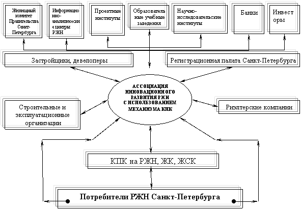 При этом единство принципов, методологии, критериев и подходов достигается посредством принятия и использования общей нормативной базы, соблюдение которой является обязательным для КПК на РЖН. Помимо этого в диссертации уточнены стандарты деятельности специализированных потребительских КПК – жилищных кооперативов и жилищно-строительных кооперативов. С целью регулирования деятельности КПК на РЖН предложено создание в Санкт-Петербурге специализированной структуры – Ассоциации Инновационного Развития РЖН с использованием механизма КПК, что иллюстрирует рис. 1.