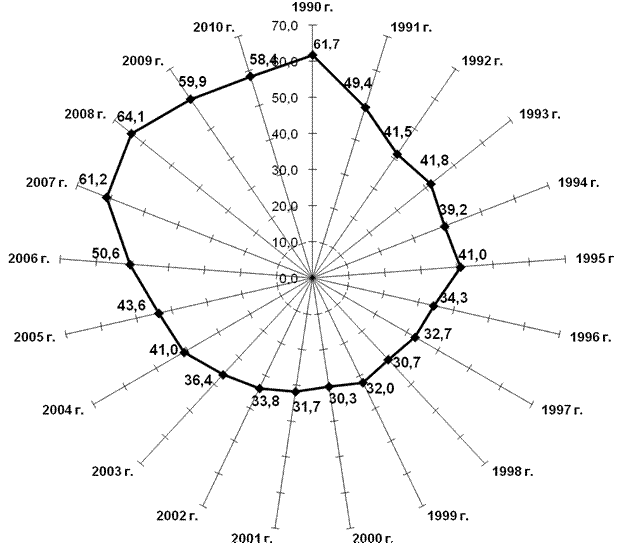 XX век, ставший уже историей, так и не разрешил одну из важнейших и острейших социальных проблем нашей страны – достойное жилье для достойной жизни российских граждан (в табл. 1 и на рис. 1 представлены основные показатели по объемам ввода и обеспеченности населения жильем граждан РФ). К сожалению, эта проблема оказалась непосильной для советского руководства наравне с сельским хозяйством и экстенсивной экономикой.