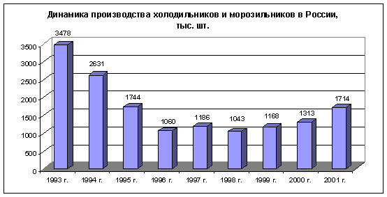 По числу холодильников на душу населения (как бытовых, так и промышленных) Россия значительно отстает от западных стран. В США, к примеру, на каждого жителя приходится 0,22 куб. м холодильников, в России - 0,07 куб. м. Между тем в последние годы производство холодильников в России росло довольно высокими темпами, в 2001 г. выпуск холодильной техники в России вырос в 1,6 раза по сравнению с 1996 г. – годом наименьшего производства.