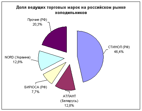 После кризиса 1998 г. объем рынка холодильников значительно снизился. Если в 1997 г. в России было продано примерно 1,8-1,9 млн бытовых холодильников, то в 1998 г. объем продаж снизился до 1,6-1,7 млн шт. Однако в 2000 г. емкость рынка начала расти, и по итогам 2000 г. был достигнут докризисный уровень 1,9 млн шт., а в 2000 г., по оценкам специалистов компании «Стинол», емкость рынка составила – 2 млн шт.