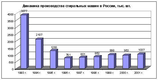 В 2002 г. рост производства отечественной электробытовой техники продолжился. В январе 2002 г. выпуск телевизоров вырос в 2,2 раза по сравнению с январем 2001 г., холодильников – на 39%, стиральных машин – на 40,6%, электромясорубок – на 46,4%.