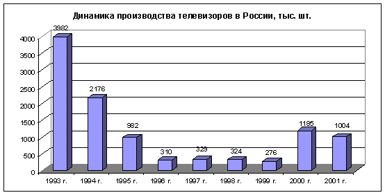 В 90-е годы выпуск телевизоров в России значительно снизился. Телевизор является в России наиболее популярным видом бытовой техники, и до последнего времени россияне отдавали предпочтение импортным моделям. Однако уже в 2000 г. ситуация в отрасли заметно улучшилось. Причиной улучшения стало оживление производства на ведущих предприятиях телевизионной промышленности, а также начало работы в России сборочных производств западных фирм. Таким образом, в 2000 г. выпуск телевизоров в России вырос в 4,2 раза по сравнению с 1999 г., в 2001 г. объем производства снизился (на 18%).