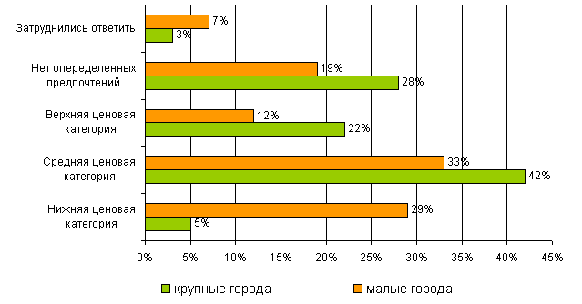 Предпочтение потребителями из крупных и малых городов Красноярского края ковров разных ценовых категорий, %