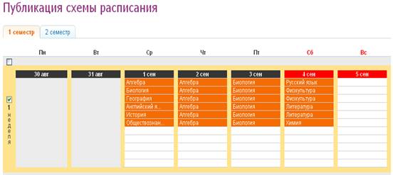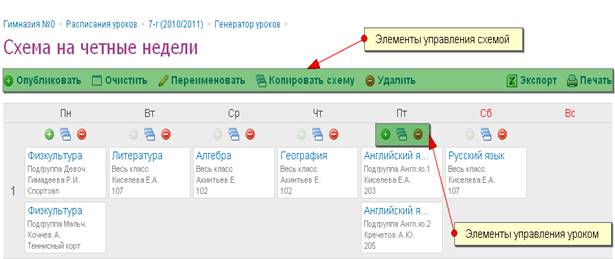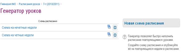 б) В случае чередования расписаний по четным и нечетным неделям, создать две схемы с соответствующими названиями и уроками и опубликовать их попеременно в сетку расписания на весь отчетный период. Для создания второй схемы используйте функцию копирования;