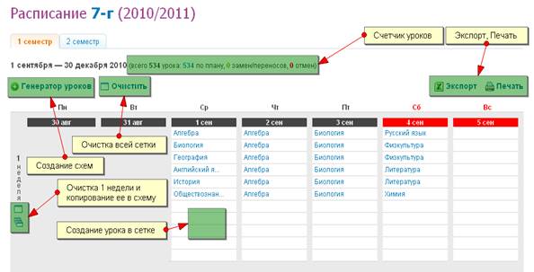 Схемы расписания доступны в «Генераторе уроков». На странице схемы расписания уроков для класса есть следующие элементы управления: