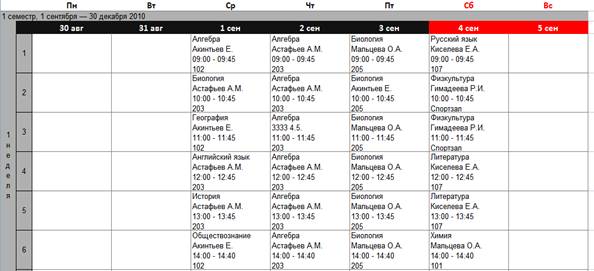· создайте схему расписания – расписание на 1 неделю для класса, которая будет шаблоном для наполнения сетки расписания на все недели отчетного периода;