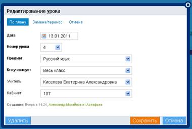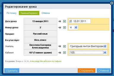1. Окно редактирования урока позволяет осуществить полную замену данных урока, а также содержит встроенный механизм замен, переносов и отмен.