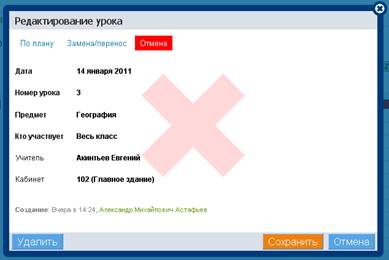 3. Для отмены урока необходимо сохранить информацию в открывшемся окне.