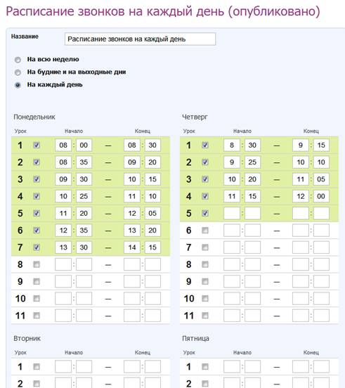 Данный пункт приводится в этой инструкции в связи с новой настройкой для расписания звонков – «На каждый день». Указанная настройка позволяет создать индивидуальное расписание звонков на каждый день недели.