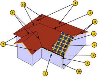 Крыша здания состоит из следующих элементов (см. рис.): наклонных плоскостей, называемых скатами (1), основой которых служат стропила (2) и обрешетка (3). Нижние концы стропильных ног опираются на мауэрлат (4). Пересечение скатов образует наклонные (12) и горизонтальные ребра. Горизонтальные ребра называют коньком (5). Пересечение скатов, образующие входящие углы, создают ендовы и разжелобки (6). Края кровли над стенами здания называют карнизными свесами (7) (располагаются горизонтально, выступают за контур наружных стен ) или фронтонными свесами (11) (располагаются наклонно). Вода по скатам стекает к настенным желобам (8) и отводится через водоприемные воронки (9) в водосточные трубы (10) и далее в ливневую канализацию.
