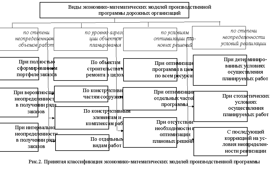 Наличие разных условий формирования производственных программ дорожных организаций обусловливает необходимость использования в зависимости от конкретных ситуаций разных критериев и различных видов экономико-математических моделей их оптимизации, которые могут быть сгруппированы по следующим признакам: степени неопределенности планируемых объемов работ, уровню агрегации производственных процессов, возможности оптимизации плановых решений, и степени неопределенности условий реализации производственной программы (рис. 2).