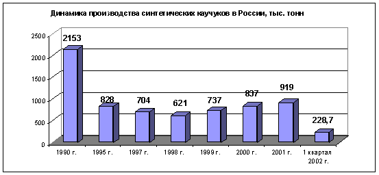 Кризисное состояние российской экономики в 90-е годы сказалось и на производстве синтетических каучуков, которое начало резко снижаться. В 1998 г. объем производства в России составил всего 621 тыс. тонн, то есть упал по сравнению с 1990 г. в 3,7 раза. С 1999 г. в отрасли начался рост производства, и в 2001 г. в России было выпущено уже 919 тыс. тонн синтетических каучуков, что на 9,8% выше уровня 2000 г. Между тем, согласно данным Министерства промышленности, науки и технологий РФ, загрузка мощностей по выпуску синтетического каучука в 2001 г. составила лишь 44,5%. Выпуск каучуков ограничивался нехваткой углеводородного сырья, в частности фракции С4, из которой производятся мономеры, в т. ч. дивинил, изопрен, изобутилен, а также сжиженных газов. Ресурсы пиролизной фракции (БДФ), из которой выделяют дивинил, также были ограничены: в 2001 г. дефицит дивинила составил 120 тыс. т. Этот фактор, по мнению специалистов Минпромнауки РФ, являлся определяющим в производстве каучуков.